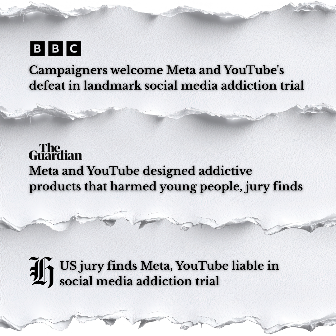 FINALLY! Big tech is paying the price for exposing young people to harm! You know, the harm they forced on kids by showing up at their house, forcing their eyes open, and holding screens in front of them for hours on end. Right?